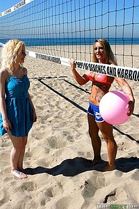 Beach babes Catie & Cali Cassidy removes bikini bras to expose natural tits